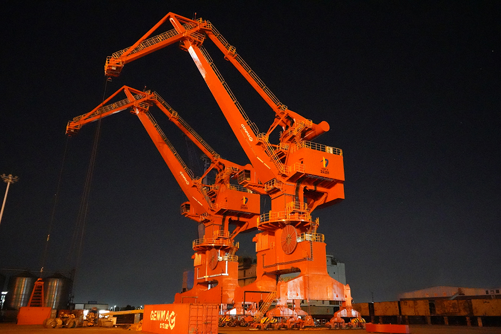 本次發(fā)運(yùn)的兩臺(tái)GENMA門座機(jī)均采用四連桿組合臂架式結(jié)構(gòu),搭配抓斗抓取裝置,整機(jī)具有自重輕、效率高、能耗低等優(yōu)勢(shì)特點(diǎn)。GENMA門座機(jī)采用了全變頻控制技術(shù)及自動(dòng)位置識(shí)別功能,能夠?qū)崟r(shí)監(jiān)控抓斗的抓取位置并通過自動(dòng)抓斗控制技術(shù)適應(yīng)不同物料,提高整機(jī)工作效率,為客戶創(chuàng)造最大的經(jīng)濟(jì)效益。