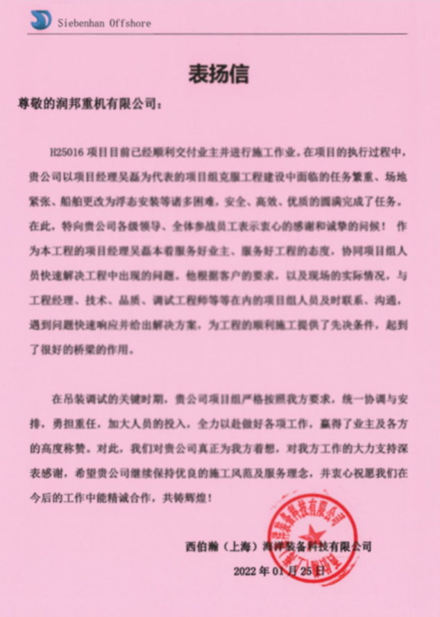 日前,潤(rùn)邦重機(jī)收到一封由西伯瀚(上海)海洋裝備科技有限公司發(fā)來(lái)的表?yè)P(yáng)信。信中,客戶公司對(duì)潤(rùn)邦重機(jī)項(xiàng)目團(tuán)隊(duì)在600噸海洋起重機(jī)項(xiàng)目推進(jìn)過(guò)程中,攻堅(jiān)克難,以高標(biāo)準(zhǔn)、高要求、高質(zhì)量、高效率完成項(xiàng)目建造表示了感謝,再次證明了潤(rùn)邦重機(jī)項(xiàng)目團(tuán)隊(duì)是一支不畏困難、能征善戰(zhàn)的專業(yè)團(tuán)隊(duì)。