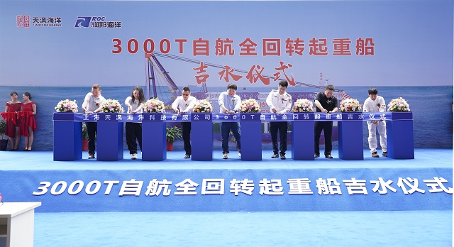 6月6日13點18分,由子公司潤邦海洋承建的上海天沨“3000噸自航式全回轉(zhuǎn)起重船”吉水儀式在潤邦海洋船臺隆重舉行。上海天沨總經(jīng)理周鋒先生,中國船級社張洪村先生,潤邦股份董事長龍勇先生、潤邦海洋執(zhí)行董事施曉越先生、總經(jīng)理邵夕吾先生等領導出席了吉水儀式,共同見證這一重要時刻。