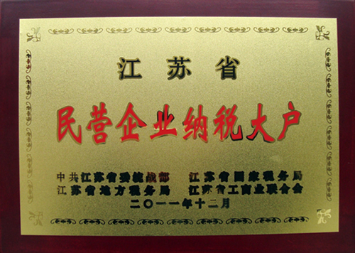 近日,公司榮膺了由中共江蘇省委統(tǒng)戰(zhàn)部、江蘇省國家稅務局、江蘇省地方稅務局、江蘇省工商業(yè)聯(lián)合會聯(lián)合授予的“江蘇省民營企業(yè)納稅大戶”的稱號。