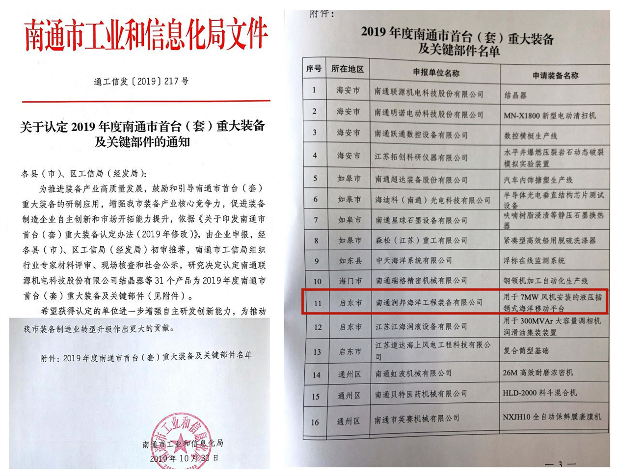 近日,由潤(rùn)邦海洋申報(bào)的“用于7MW風(fēng)機(jī)安裝的液壓插銷式海洋移動(dòng)平臺(tái)”項(xiàng)目獲南通市2019年度首臺(tái)(套)重大裝備及關(guān)鍵部件認(rèn)定。