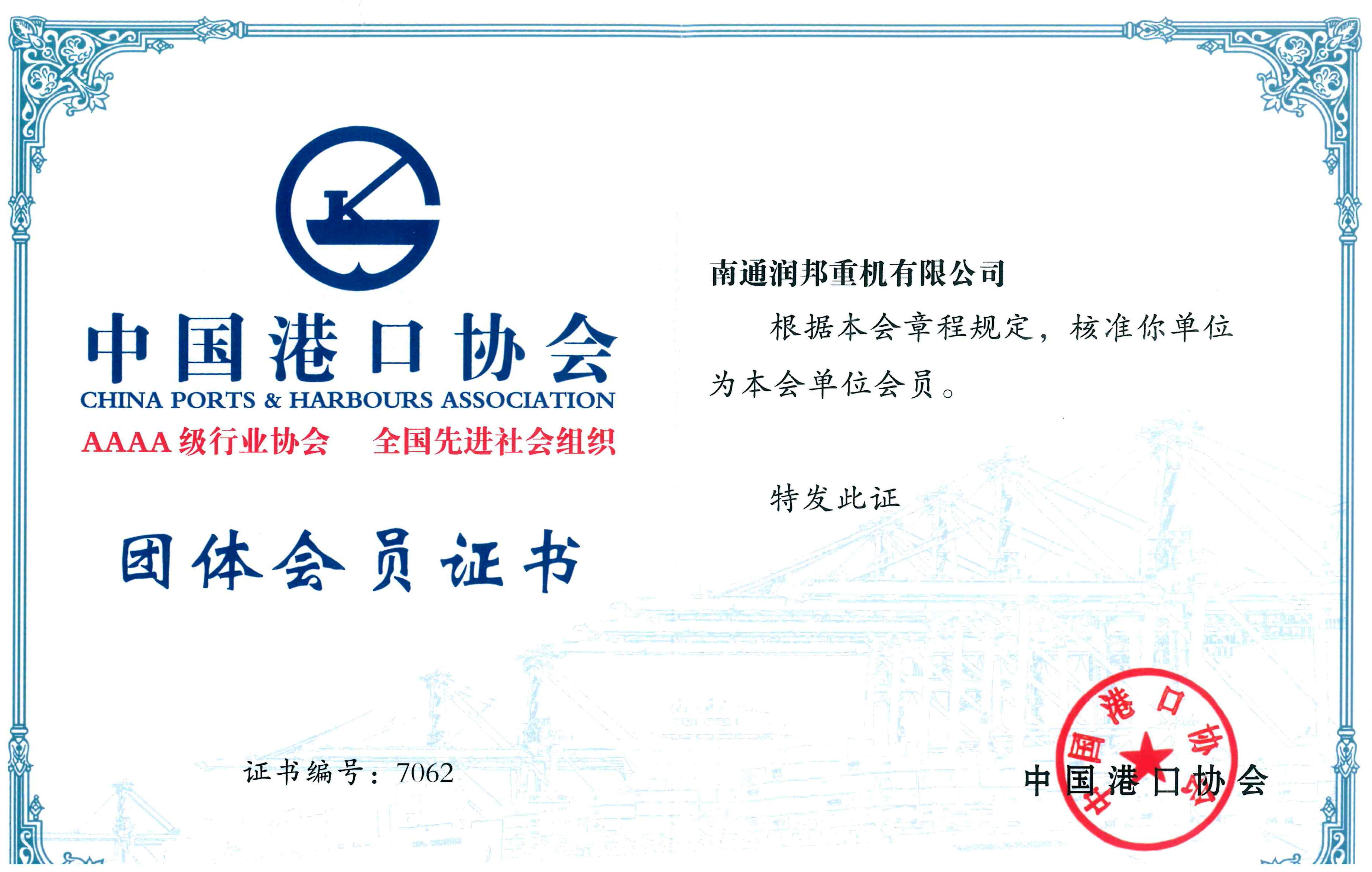 近日,子公司潤(rùn)邦重機(jī)加入中國(guó)港口協(xié)會(huì),成為其會(huì)員單位。 中國(guó)港口協(xié)會(huì)是由中華人民共和國(guó)民政部批準(zhǔn)設(shè)立的中國(guó)港口界唯一的全國(guó)性行業(yè)協(xié)會(huì),是由全國(guó)港口行業(yè)內(nèi)以及與港口行業(yè)相關(guān)的企事業(yè)單位自愿組成的,跨地區(qū)、跨部門的非營(yíng)利性的社...