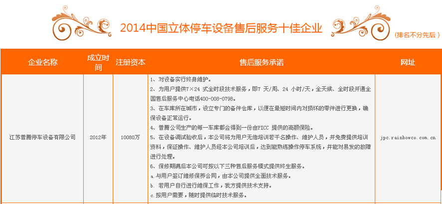 近日,子公司江蘇普騰獲得由中國(guó)采購(gòu)與招標(biāo)網(wǎng)及中國(guó)名企排行網(wǎng)聯(lián)合評(píng)選出的“2014中國(guó)立體停車(chē)設(shè)備售后服務(wù)十佳企業(yè)”。