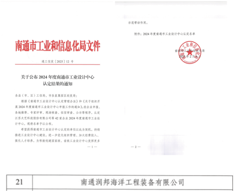近日,南通市工業(yè)和信息化局公布2024年度南通市工業(yè)設(shè)計(jì)中心認(rèn)定結(jié)果的名單,子公司潤(rùn)邦海洋經(jīng)過(guò)專(zhuān)家評(píng)審、現(xiàn)場(chǎng)核查、征信審查等程序,最終被認(rèn)定為2024年度南通市工業(yè)設(shè)計(jì)中心。此次設(shè)計(jì)中心的認(rèn)定是對(duì)潤(rùn)邦海洋創(chuàng)新能力、設(shè)計(jì)水平及服務(wù)...