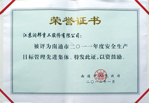 近日,江蘇潤邦重工股份有限公司被南通市人民政府評為“南通市2011年度安全生產(chǎn)目標管理先進集體”。同時,公司安全環(huán)境部部長宋鋒先生獲得了由南通開發(fā)區(qū)管委會授予的“南通經(jīng)濟技術(shù)開發(fā)區(qū)2011年度安全生產(chǎn)先進個人”稱號。